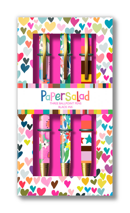 Paper Salad Ballpoint Pen Set – 3 Black Ink Pens with Colourful Floral & Star Designs | Gift-Boxed