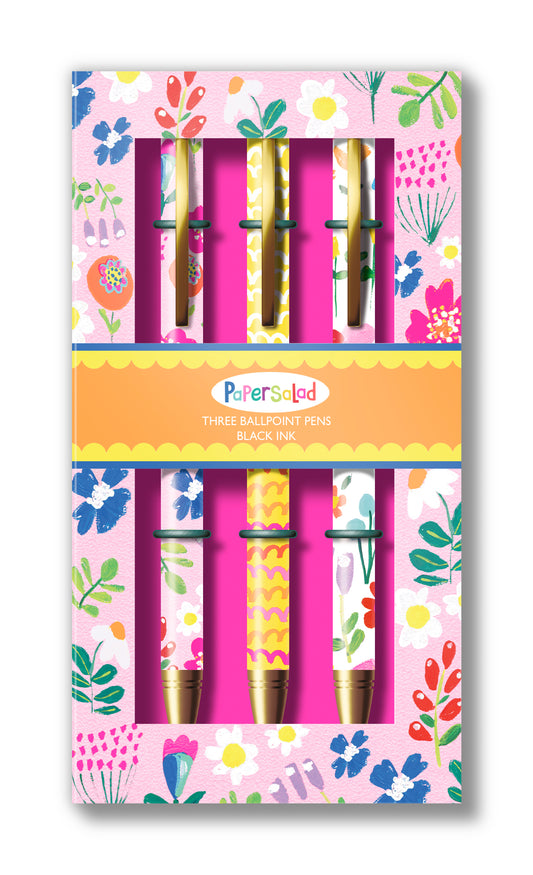 Paper Salad Ballpoint Pen Set – 3 Black Ink Pens in Floral Gift Box