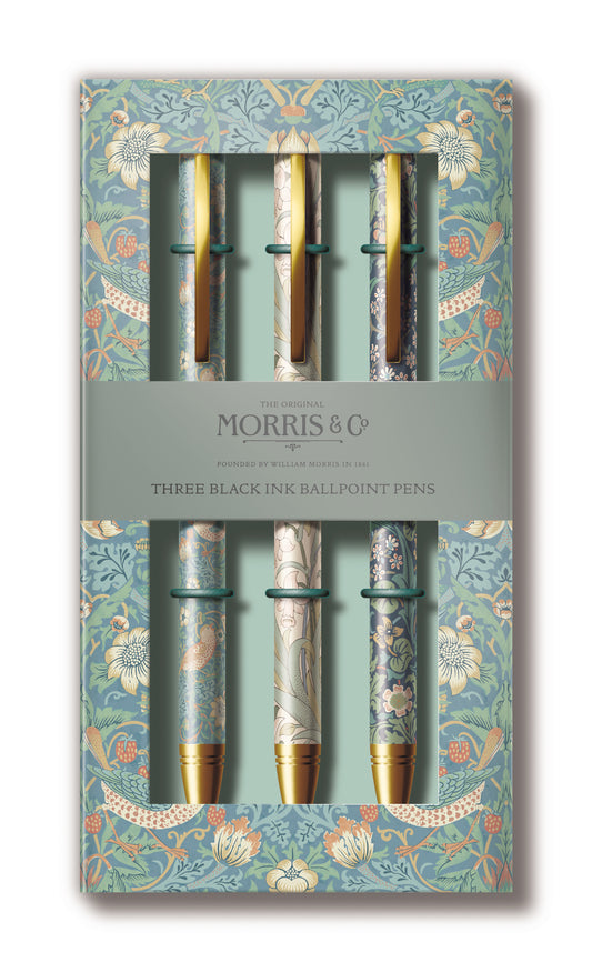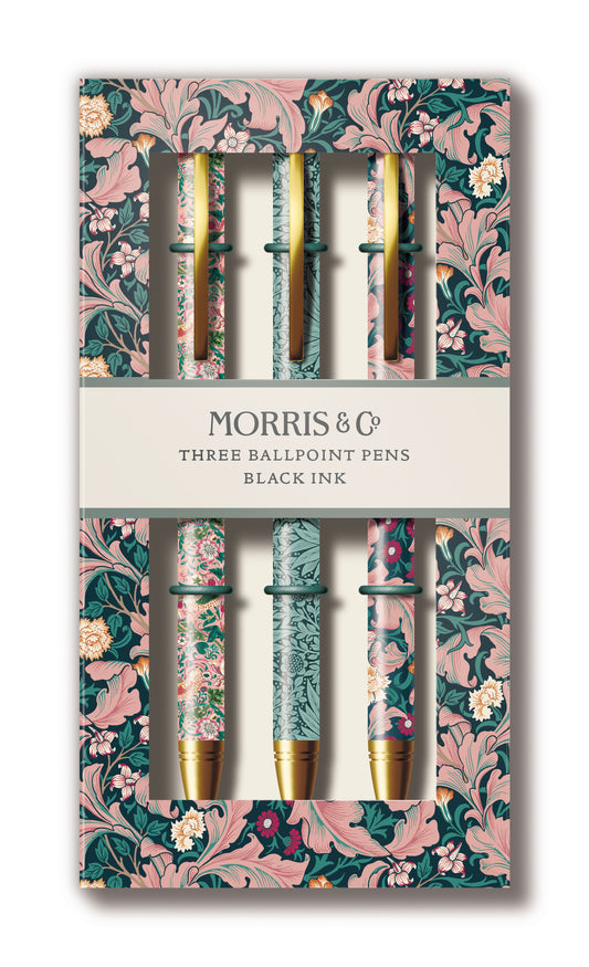 Morris & Co. Ballpoint Pen Set – 3 Black Ink Pens with Classic Floral Designs | Gift Boxed