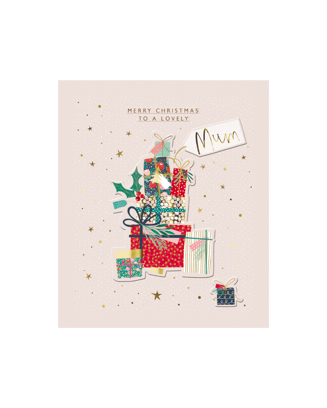 A cheerful card for Mum featuring a tall stack of beautifully wrapped gifts. Joyful and festive — perfect for the mum who loves Christmas surprises.