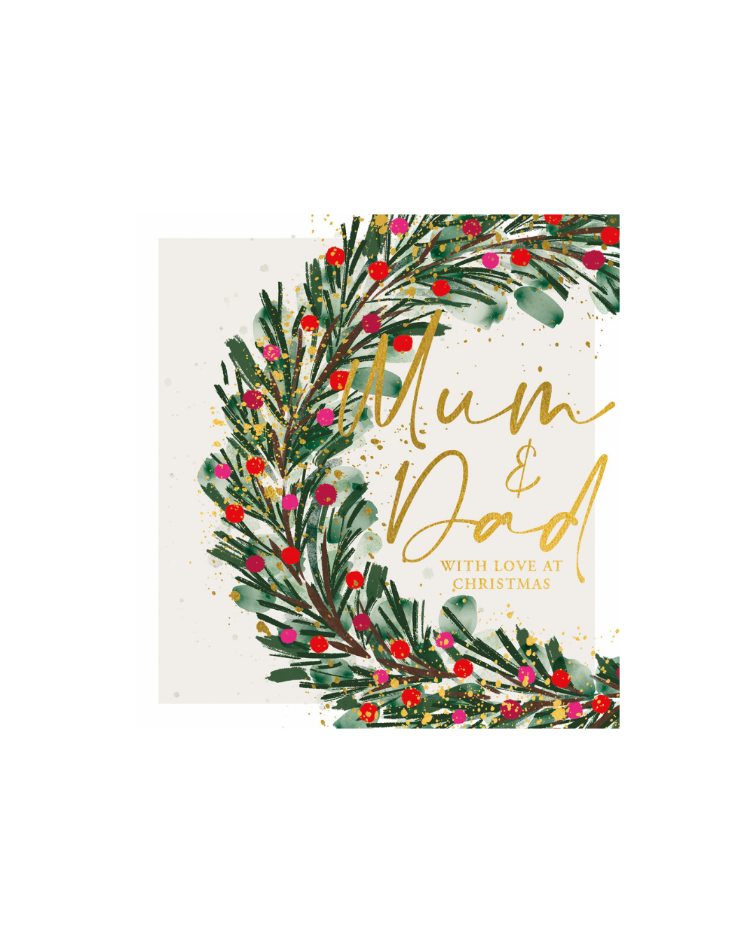 Send festive cheer with this Christmas card. This card features a traditional wreath design and reads 'To Mum and Dad Merry Christmas'.