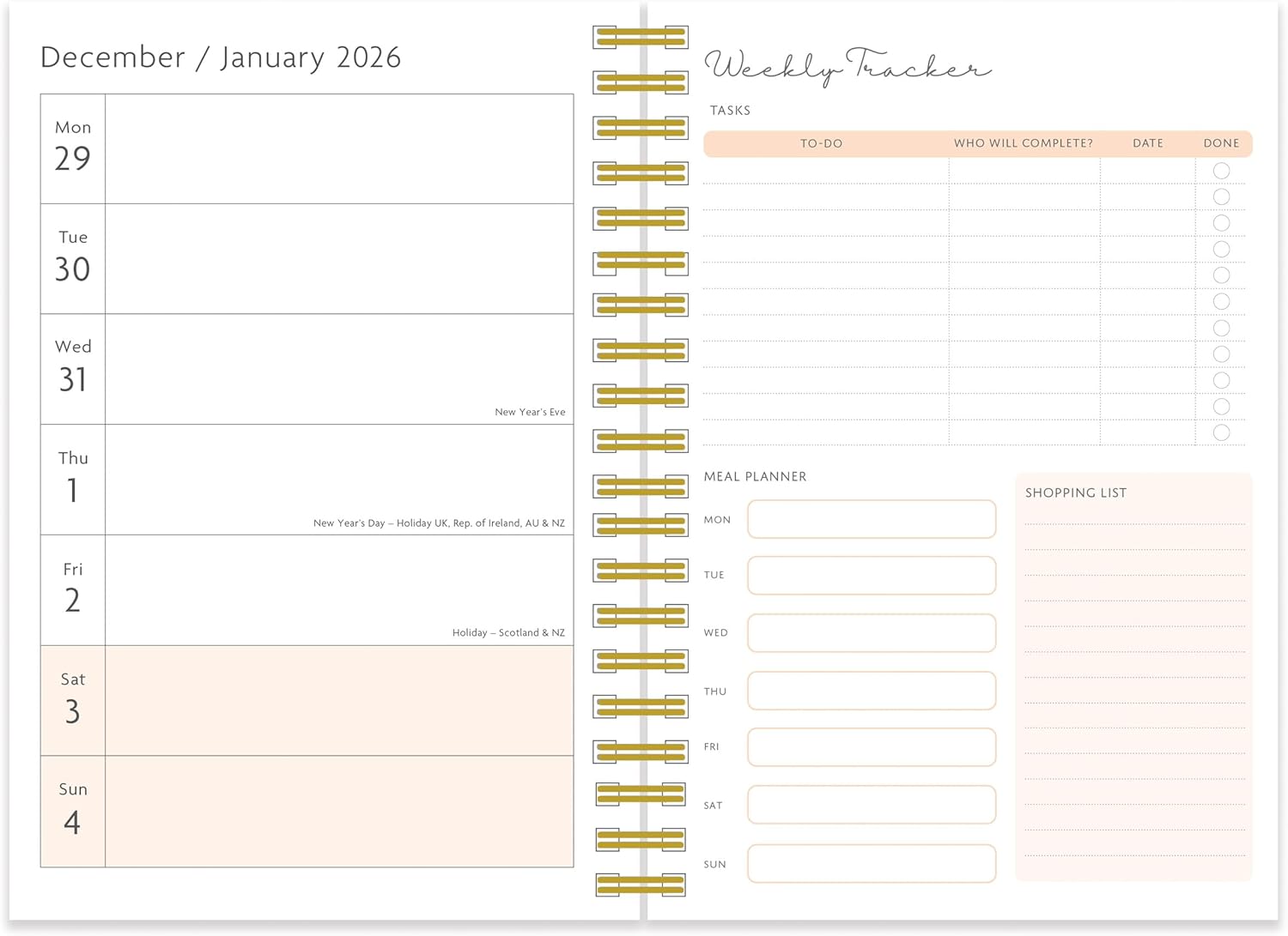 - With To Do and Notes sections for each week to keep you organised and gold foil detail on the cover.