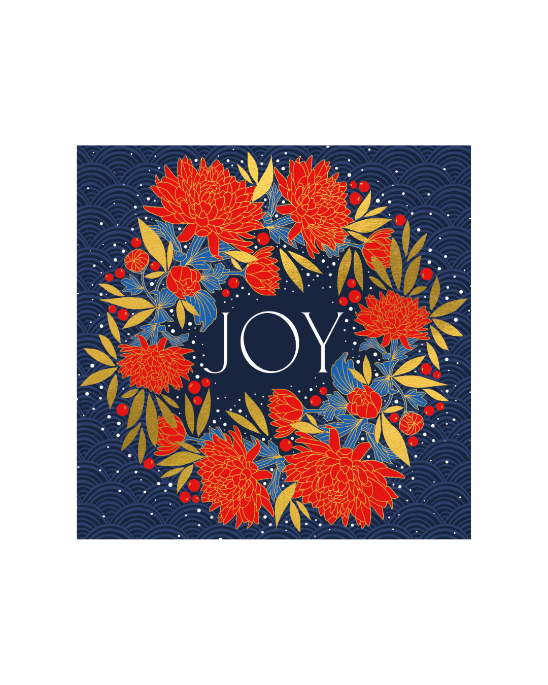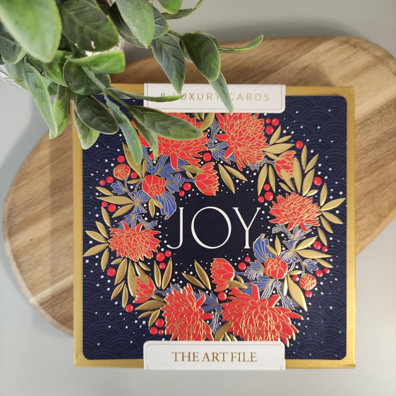 These elegant cards are perfect for those wanting to send a higher quality Christmas card. This box contains 8 luxury Christmas cards that feature a festive 'Joy' surrounded by a wreath of botanicals.