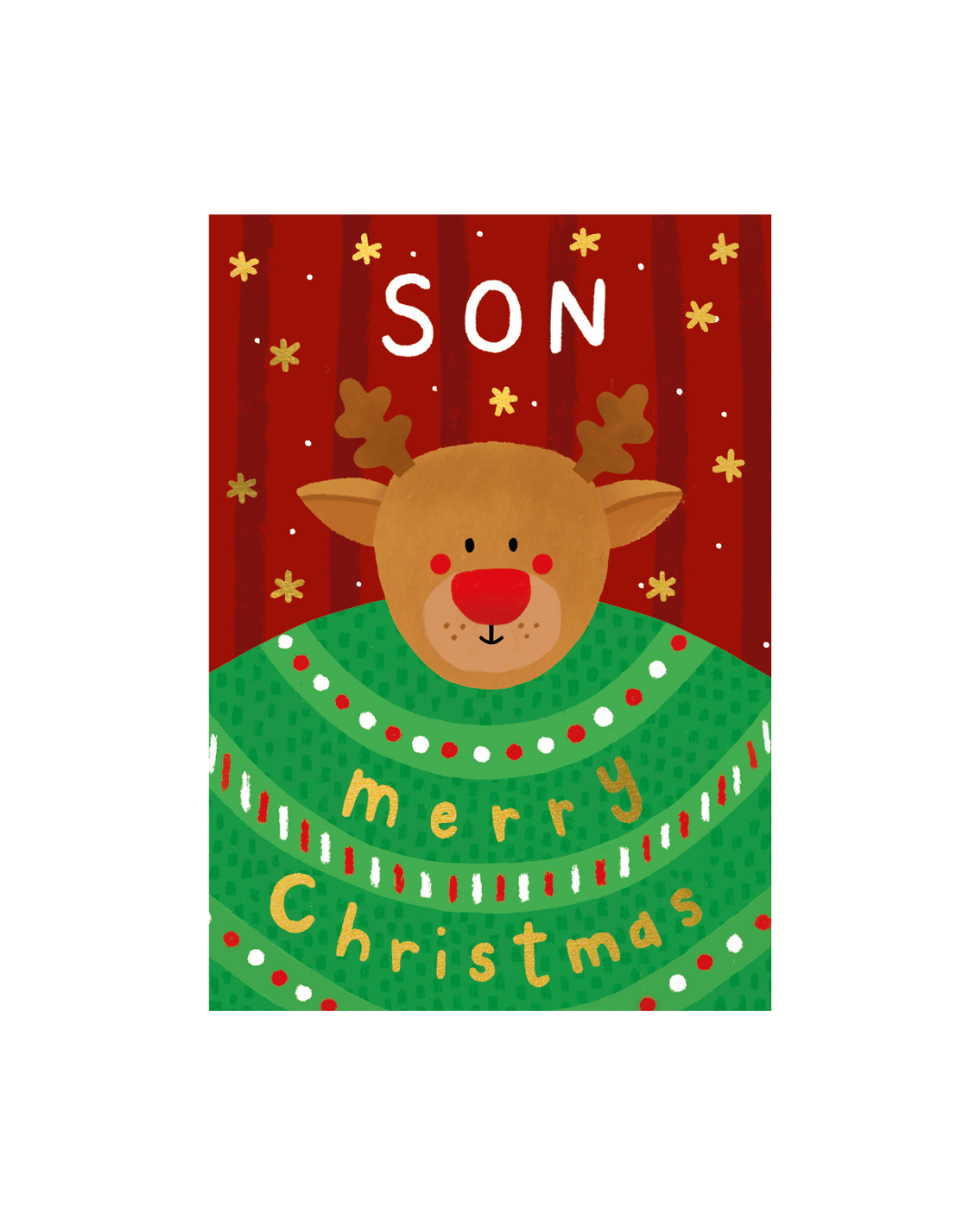Send festive cheer with this Christmas card. This card features a reindeer and reads 'To my son, Merry Christmas'.