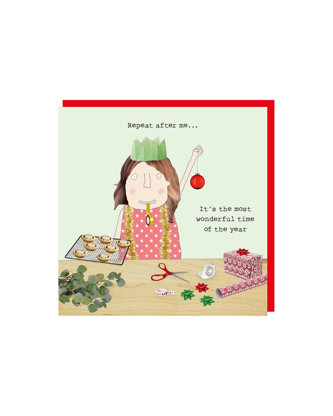 Fun Christmas card for friends or family. ‘Repeat after me… It’s the most wonderful time of the year.’ This Christmas card is blank inside for your own Christmas message. Designed and printed in the UK on FSC approved card, comes with a poppy red envelope.